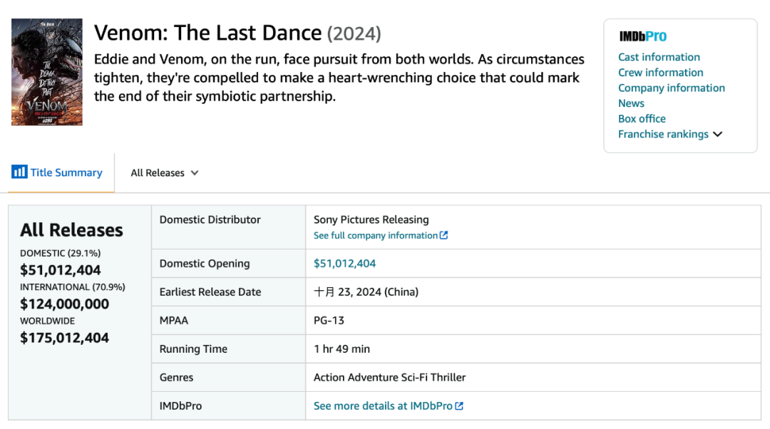 在北美,《毒液:最后一舞》(以下简称《毒液3》)首映超过5千万美元,却创下系列最低的开画数字,且一如既往收获媒体的“烂番茄”待遇。所幸影片在海外市场扳回一局,全球票房已攀升至1.75亿美元,再加上预算与前作相比仅略微上浮,有望为制片方带来颇为可观的利润。