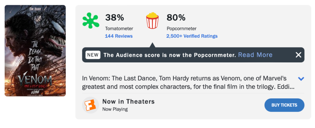 从口碑来看,《毒液3》的烂番茄新鲜度低至38%,影评人称赞汤姆·哈迪为影片“注入了足够的魅力”,但最终成品却无力支撑“复杂的基调野心”,对羸弱的故事大加挞伐。但《毒液3》的爆米花指数达到80%,显示观众和媒体之间并无共识。作为对比,《毒液2:屠杀开始》在烂番茄上则录得57%和84%。在映后环节,《毒液3》的CinemaScore评分只有B-,在系列中位列末席。