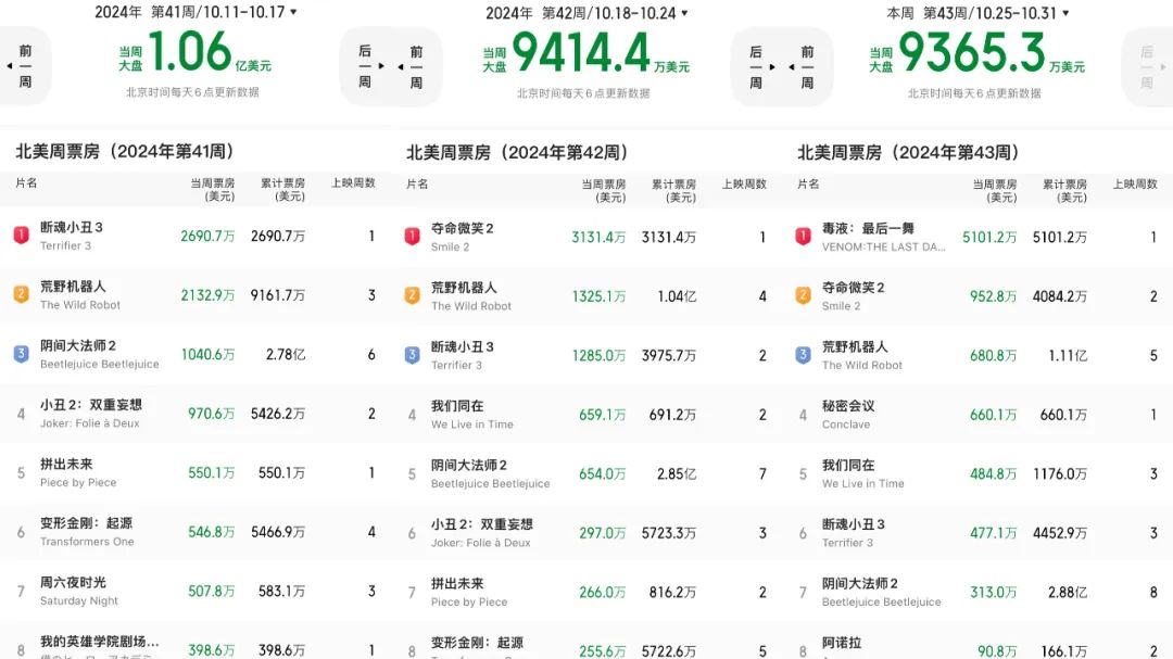 据IMDbPro统计,《毒液3》从25号开始铺开至北美4131家影院,首日票房达到2202万美元,带动大盘环比飙升逾七倍。随后两天《毒液3》均下滑两成以上,最终首周末报收于5101万美元,单馆收益为1.23万美元。这在今年的所有影片中暂居第12名,优于月初崩盘的《小丑2:双重妄想》,却不及6至7千万美元的业界预期。