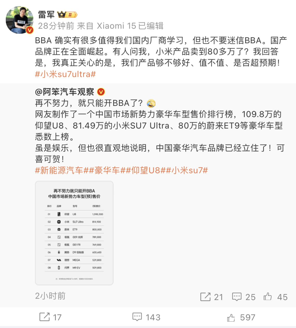 10月30日,有网友制作了中国市场新势力豪华车型售价排行榜,并表示“再不努力就只能开BBA”。其中,109.8万的仰望U8、81.49万的小米SU7 Ultra、80万的蔚来ET9等豪华车型悉数上榜。对此,雷军转发相关消息表示,“BBA确实有很多值得我们国内厂商学习,但也不要迷信BBA。国产品牌正在全面崛起。有人问我,小米产品卖到80多万了?我回答是,我真正关心的是,我们产品够不够好、值不值、是否超预期!”