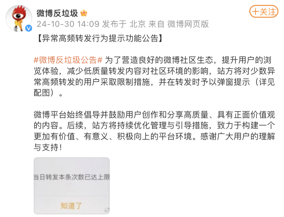 10月30日,微博表示,为了营造良好的微博社区生态,提升用户的浏览体验,减少低质量转发内容对社区环境的影响,站方将对少数异常高频转发的用户采取限制措施,并在转发时予以弹窗提示。