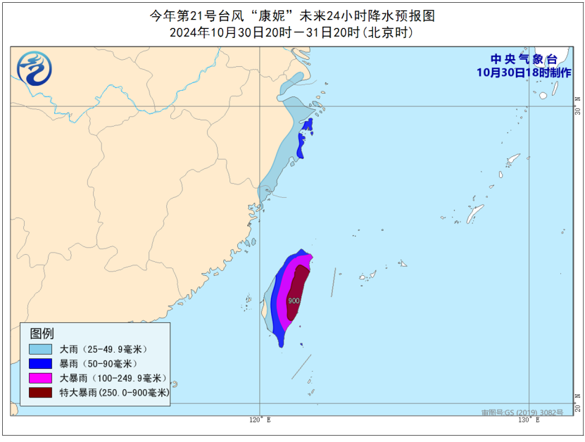 降水预报:30日20时至31日20时,浙江东部、福建东北部等地部分地区有大到暴雨,台湾岛大部有暴雨或大暴雨,其中台湾岛东部部分地区有特大暴雨(250-900毫米)。