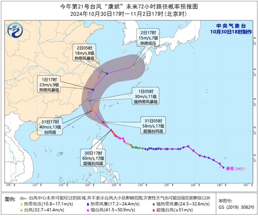 中央气象台10月30日18时发布台风橙色预警:今年第21号台风“康妮”(超强台风级)的中心今天(30日)下午5点钟位于台湾省台东市东南方向约420公里的西北太平洋洋面上,就是北纬20.1度、东经124.0度,中心附近最大风力有17级(60米/秒),中心最低气压为920百帕,七级风圈半径380-480公里,十级风圈半径180-200公里,十二级风圈半径110公里。