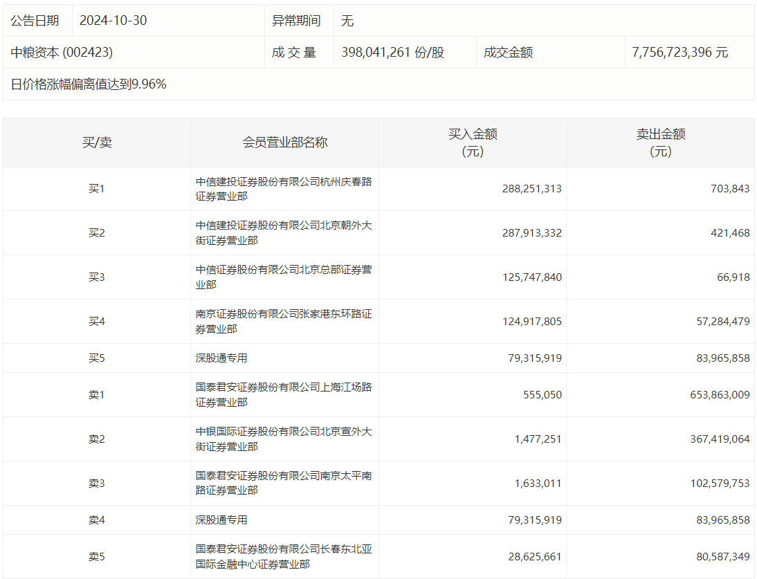 中粮资本今日涨停,龙虎榜数据显示,上榜营业部席位全天成交22.85亿元,占当日总成交金额比例为29.46%。其中,买入金额为9.38亿元,卖出金额为13.47亿元,合计净卖出4.08亿元。