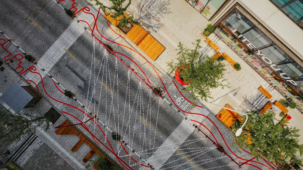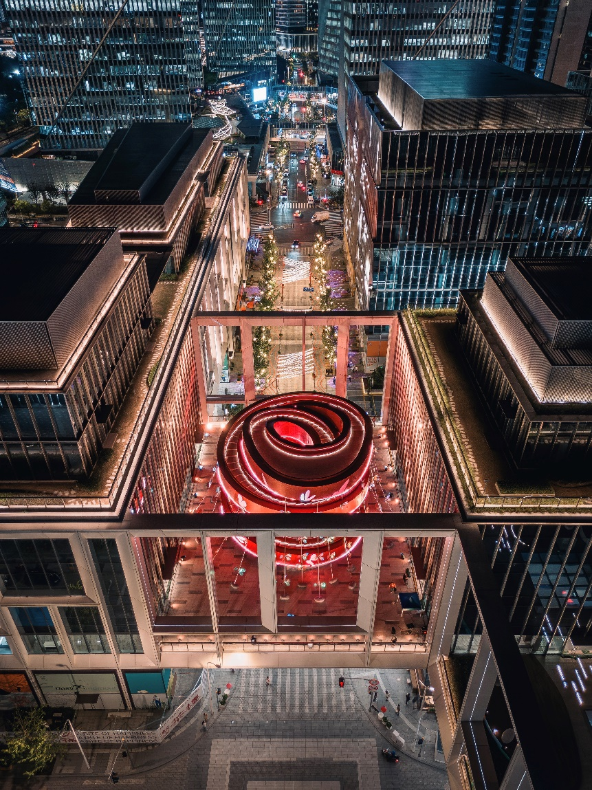 而当人们的视线焦点移至街道上方的连廊空间时,又会被项目内的地标性公共艺术装置“无尽之旋”牢牢吸引。它的灵感来自于纽带和莫比乌斯环,大气灵动的红色线条向外延伸,延伸到路面和街道,甚至是小小的宠物友好标志,赋予街道温暖与活力的同时,似乎城市街巷与商业空间的无限可能也正随着这抹红色徐徐展开。