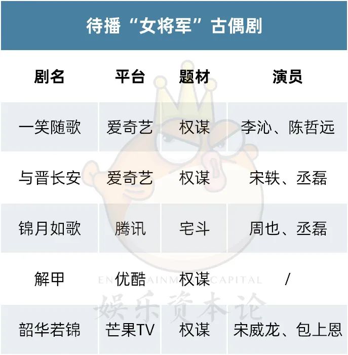 爱奇艺两部待播古偶《一笑随歌》《与晋长安》里,女主皆为当朝名将,预告片也不乏男女双强的名场面。周也出演女将军的《锦月如歌》原著小说名就叫《重生之女将星》。通常这样设定的古偶,主线则会用权谋的方式推进,大有家国情怀,小有儿女情长,对落地古偶来说,也是一种“常规”套路。