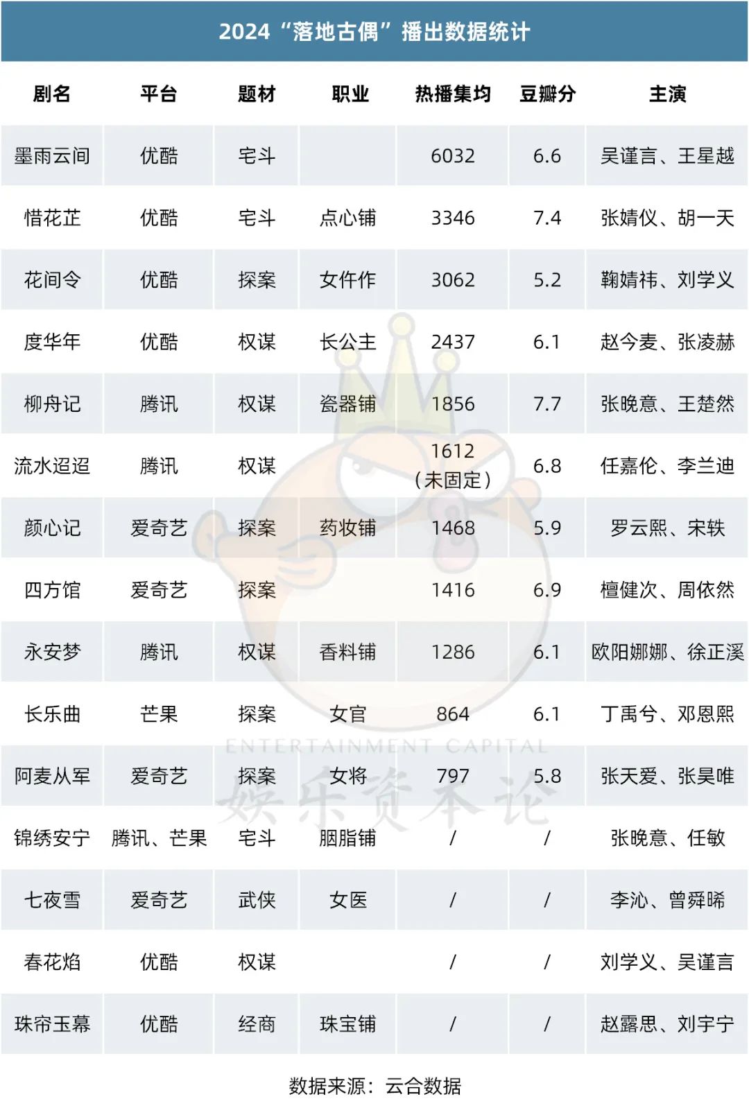 不算差,但与古偶辉煌时代的成绩相比开始有了落差。尤其是落地古偶在戏剧性方面,想象空间不如仙侠玄幻高概念,题材上也有了很明显的趋同。尤其是《珠帘玉幕》播出在即,号称首部专注“经商”的大女主古偶剧,其实《惜花芷》里花芷开过点心铺子,《永安梦》里沈甄开过香料铺子,《柳舟记》里柳眠棠干瓷器铺或者镖局都能成功……2024年的古偶大女主们已经“商战”好一段日子。