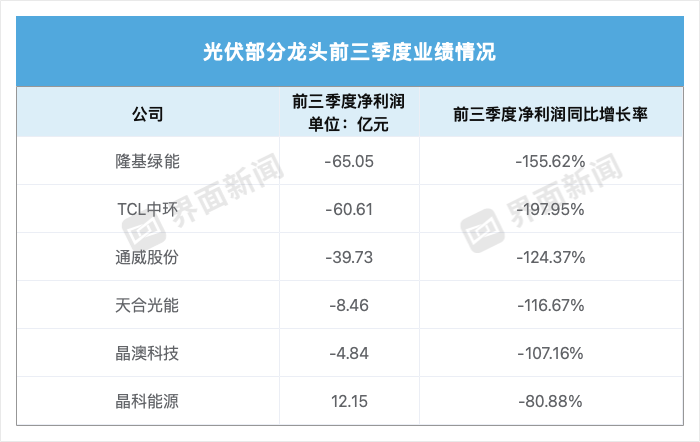其中,TCL中环成为单季亏损王,三季度亏损近30亿元,几乎与上半年亏损额相当。上半年还盈利的天合光能(688599.SH)三季度亏损近14亿元,环比暴跌。