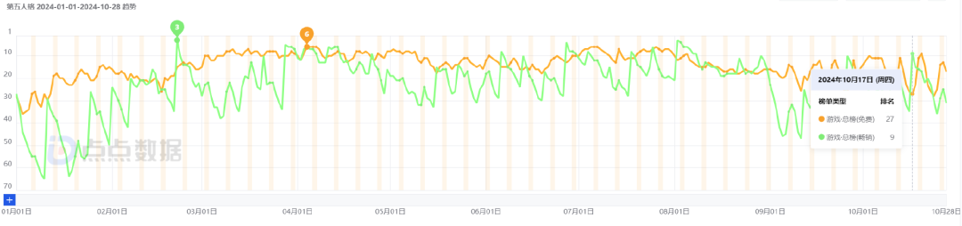 点点数据显示,今年以来《第五人格》最好的成绩是iOS畅销榜第3名、免费榜第6名。日常保持在畅销榜30名左右。