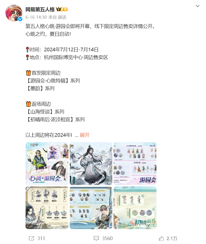 ②7月12日至7月14日在杭州国际博览中心举办《第五人格》心跳园游会,活动内容包括场景还原、同人街区、会场限定周边贩售、西湖系列周边限时场贩、庄园心音·音乐会、cosplay 总决赛、嘉宾签售活动等。