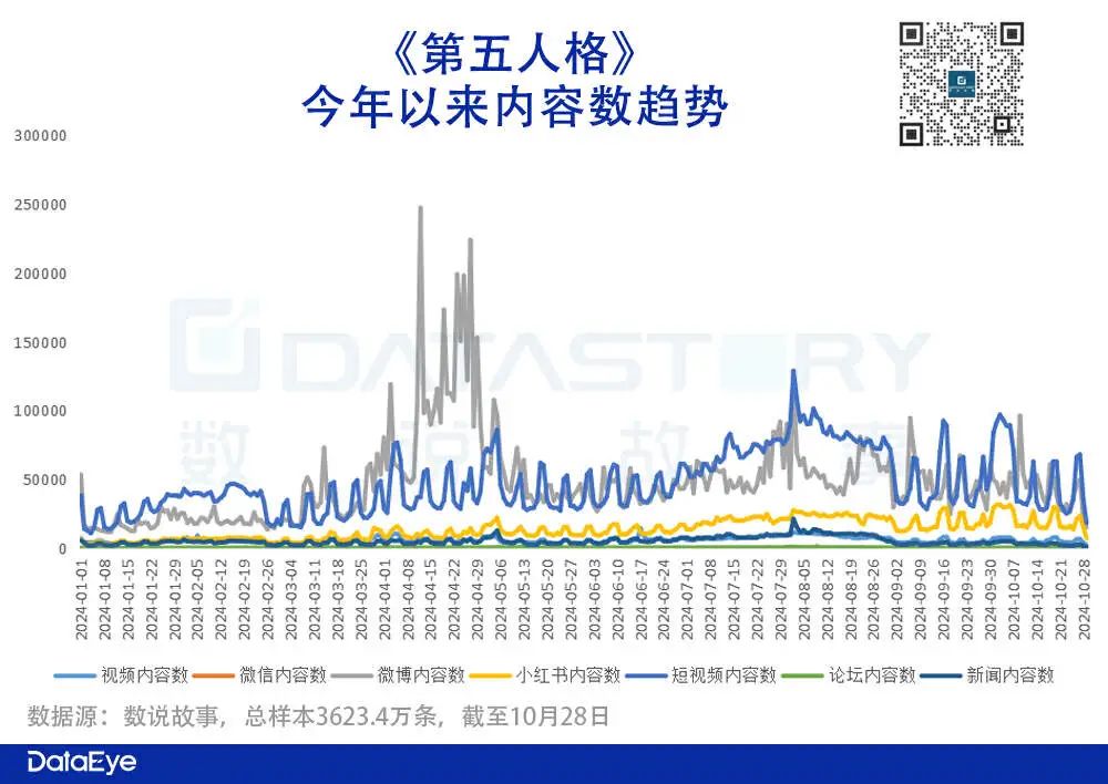 内容条数方面:截至10月28日,国内全网内容条数约为3623.4万条,其中微博内容数最多,其次是短视频和小红书。从时间维度来看,4月开启《第五人格》6周年庆典、演绎之星评选活动,并与小小梦魇联动,全网舆论达到峰值。