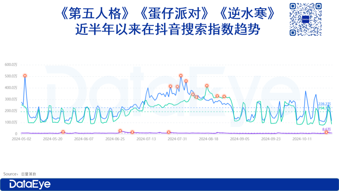 从传播侧来看,巨量算数显示,近半年来,《逆水寒手游》在社交平台的搜索指数呈现明显的下滑,《蛋仔派对》仅仅是在暑期档尾声有一波小幅度的增长,《第五人格》则呈现出显著的增长,同比增长410.04%。