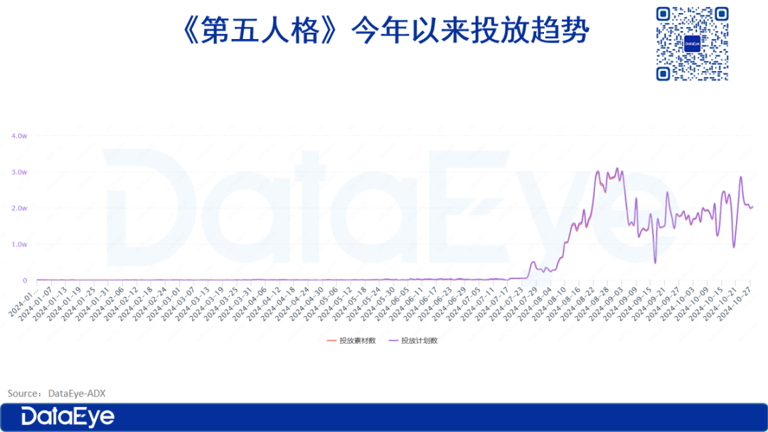 DataEye-ADX数据显示,《第五人格》在今年七月底开始加大投放,持续走高,到九月达到投放巅峰,30721组(视频+图片)素材。随后开始大幅度下降,九月、十月配合活动和版本更新前后会加大投放。