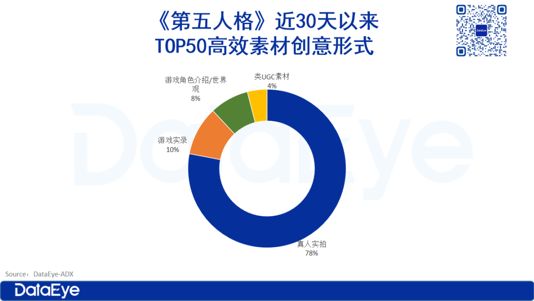 DataEye-ADX数据显示,《第五人格》近30天以来最多计划使用的TOP50视频素材内容中,占比最高的是真人实拍达78%,其次是游戏实录,占比10%,游戏角色介绍和类UGC内容占比较少,为8%和4%。