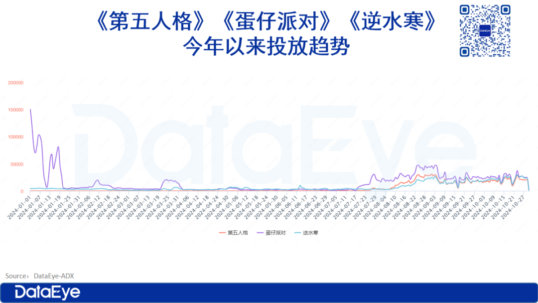 从买量侧来看,一月中下旬《蛋仔派对》投放大幅缩减,直到进入暑期档后三款游戏开始加大投放力度,而这三款游戏中,属《第五人格》投放量增加最为明显,日均投放素材数甚至超过《逆水寒》。