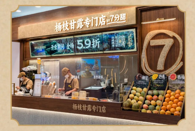 第三,原料公示,明档现制。喜茶波波站强调“手作”、“现制”、“鲜牛乳”,采用270天自然成熟的木薯制成波波,每日现熬一小时黑糖珍珠,还专门做了一个木薯原料展示墙;七分甜杨枝甘露专门店则在鲜果陈列区摆放制作杨枝甘露的椰子、芒果、西柚等原料,采用明档吧台在顾客面前现切现做,让消费者直观感受产品的制作流程。