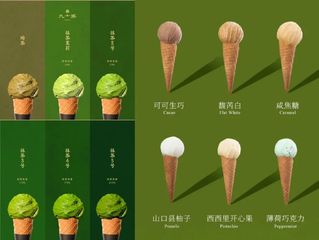 例如,人气火爆的抹茶冰淇淋专门店「九十葉」除了五款不同浓度的招牌抹茶外,还有薄荷巧克力、开心果、咸焦糖等特色单品。