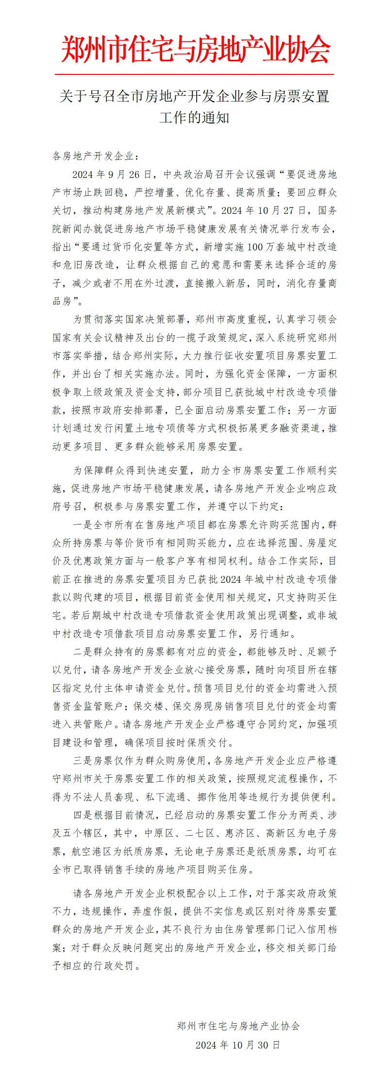 郑州市房协发布《关于号召全市房地产开发企业参与房票安置工作的通知》。通知提到,全市所有在售房地产项目都在房票允许购买范围内,群众所持房票与等价货币有相同购买能力,应在选择范围、房屋定价及优惠政策方面与一般客户享有相同权利。