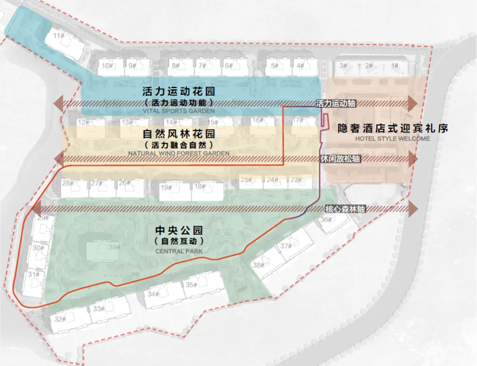 先来看一张平面示意图:平面铺开的三个主题园林,地形是有高差的。巧妙结合「三台地」的地势差,做出不同的功能模块,让全龄化的家庭成员,都能享受到丰富的活动空间。