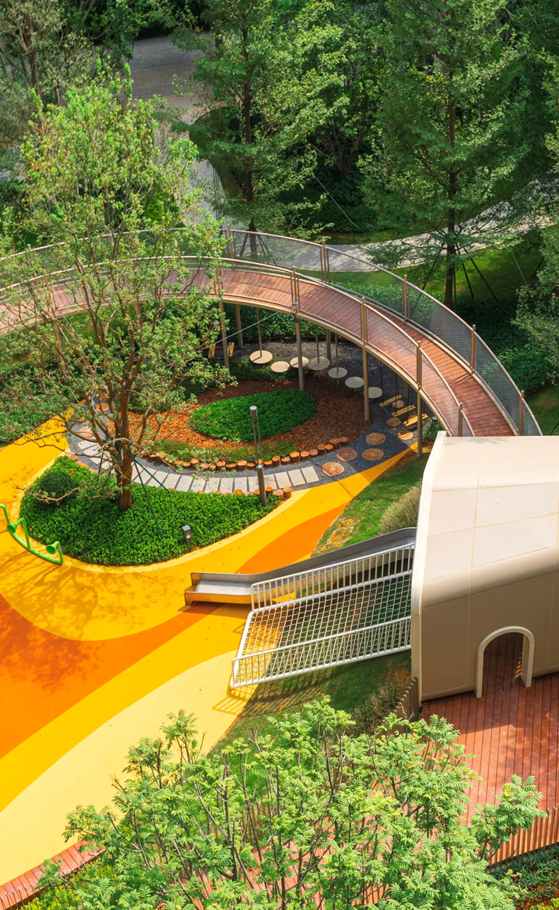 早教期孩子,开始探索和寻求认知,这里有自然科普区、互动旱喷,带他们认识植物、小昆虫,激发无限好奇。学龄期的孩子,需要的是独立、冒险,园区内则设置了林中树屋,空中悬桥,沙坑洞穴、特色吊桥等丰富游乐设施。留给孩子一个自由嬉戏的下午,在折叠空间内,攀、爬、滑、跳、转、跑......探索无限的乐趣。