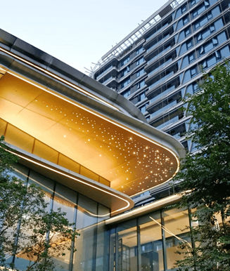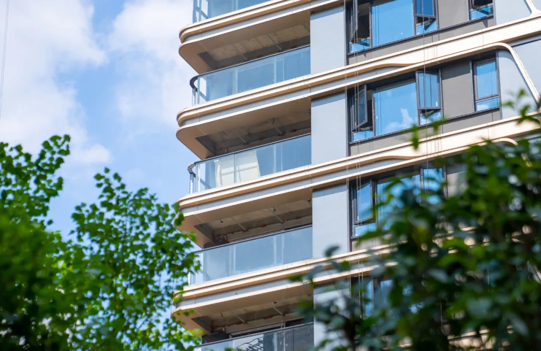 看看目前实景的一些细节:外立面采用轻质铝板幕墙,搭配云翼曲线造型,颜值蛮高,昭示性拉满。同时,弧形阳台的设计,也保留了完整的观景面,站在阳台上,你能够享受到270°环幕包裹的视野。当然,弧形的切割,新型铝板材料,都意味着更高昂的造价成本。