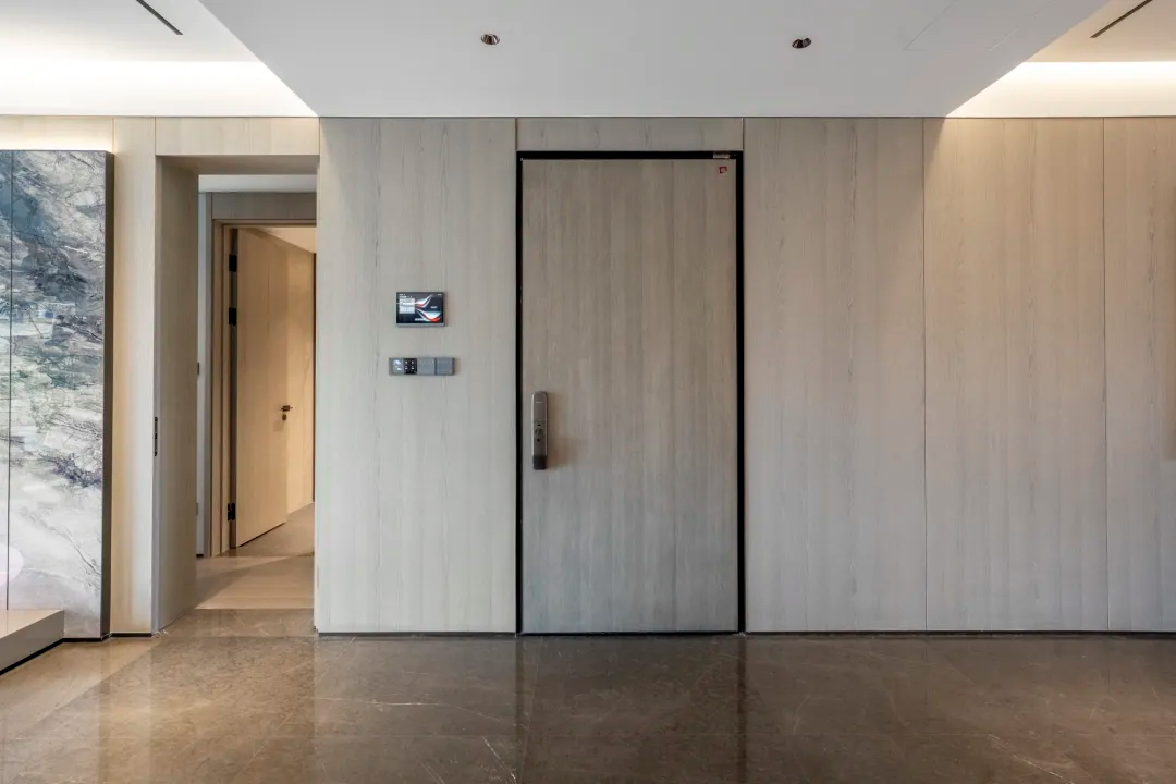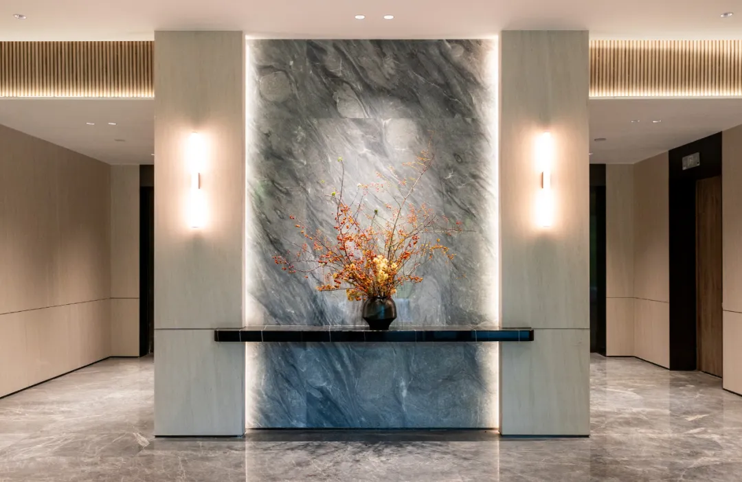 我想很大的一个原因,是它用了大面积低饱和度色调的木饰面。首层大堂,连贯性的木饰面,搭配爱马仕灰奢石,反而让空间有了更温馨的柔和感。甚至,连电梯轿厢都铺满了木饰面,整个公区空间,有了一种自然的过渡感。