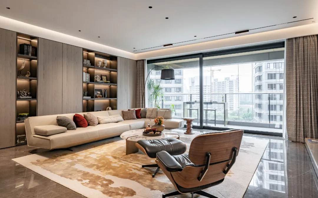 再拿新的实景样板间来说,南向阳台足足有超10米开间。这么大的视野景观面,如何保证不被切割?缦云的做法,则是在门窗系统上做功夫,配置两扇巨幕的推拉门。于是,室外的景观、南向的阳光,都能更完整、更直观的闯入室内。