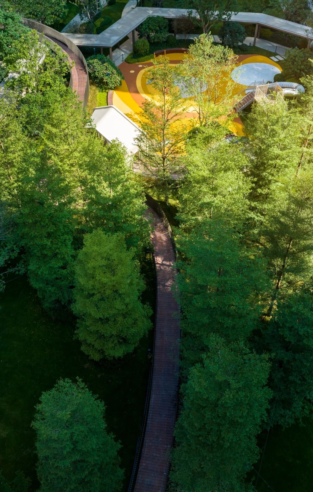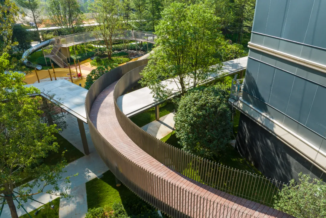 普通园林里,或许有静区的功能,但趣味性是不够的。而走在缦云星际云廊上,你会感受到,脚下有生机,有嬉闹,但你仍能不被打扰,全身心沉浸在一场有趣的自然漫游中。值得一提的是,云廊无界串联小区各处,也让每一栋楼的业主,都能轻松加入到这种漫游中。