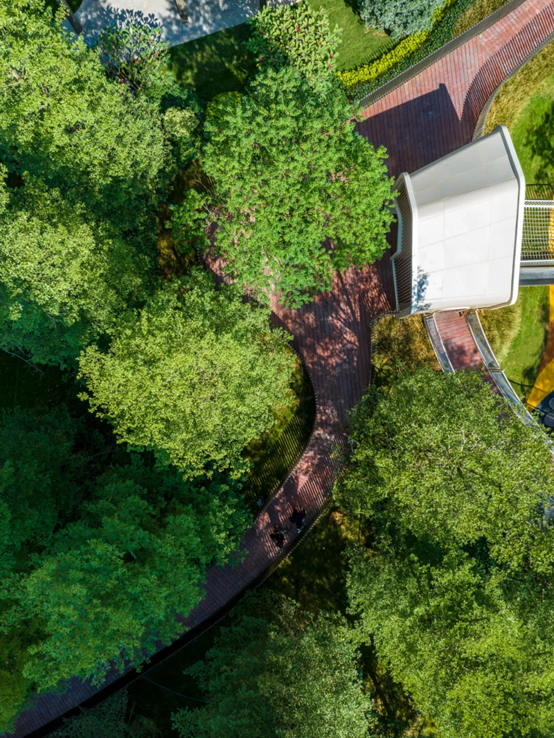 折叠的另一面,则纵向维度的设计。它巧妙植入了星际云廊,让园林开始纵向生长,呈现曲径通幽的垂直空间。于是,园林不止能玩、能赏,更能沉浸式互动。