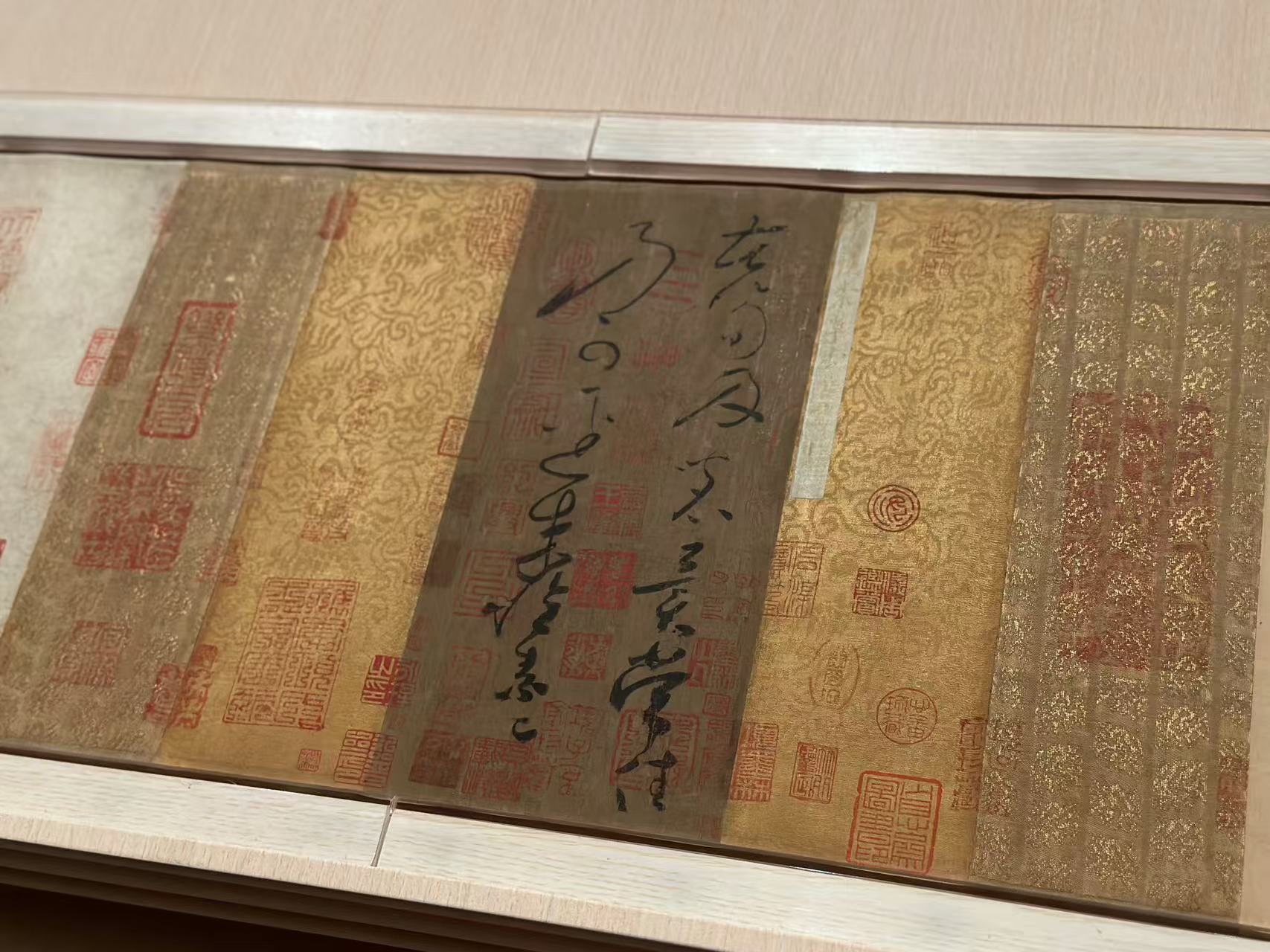 “二王”的展柜旁、唐代怀素草书《苦笋帖》卷,是迄今传世怀素作品中唯一没有争议的真迹,已被列入禁止出境文物名单。帖卷只有短短14个字,内容也十分生活化,但飘逸洒脱的字迹令历代收藏家珍爱不已。不仅有宋徽宗的宣和印及金粉所书的签条以及清代乾隆皇帝的题签和引首,还有包括宋代书画家米芾之子米友仁在内的历代收藏家题跋和鉴赏印。
