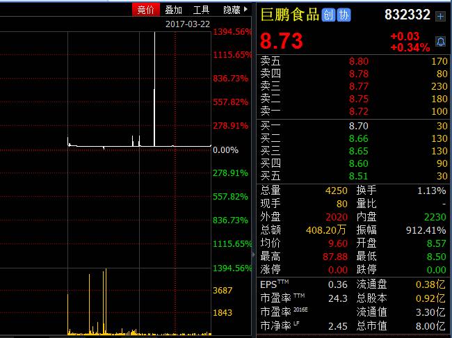 巨鹏食品(832332)上午10点21分左右出现一笔异常交易,其在87.88元/股成交5000股,涨幅瞬间达到910.11%,成交40万元。截至下午收盘,巨鹏食品报收8.73元/股,涨0.34%,成交42.5万股,成交金额达408.2万元。