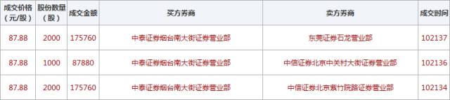 根据股转系统官网披露的信息,中泰证券烟台南大街证券营业部在10点21分,仅用4秒即分别从东莞石龙营业部、中心证券北京中关村大街证券营业部以及中信证券北京紫竹院路证券营业部买入2000股、1000股和2000股。