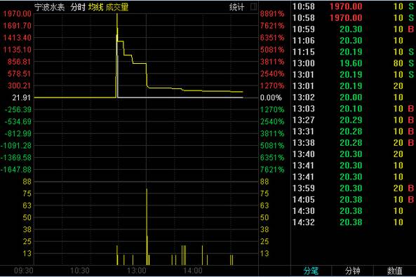 3月9日上午10时58分左右,一位新三板投资者在买入宁波水表(834980)时忘点小数点,误将买入价格19.70元操作为1970元,导致在26秒钟的时间内突然出现两笔1970元/股的协议成交,每次分别成交1000股,合计成交394万元,宁波水表股价振幅高达8901.87%。