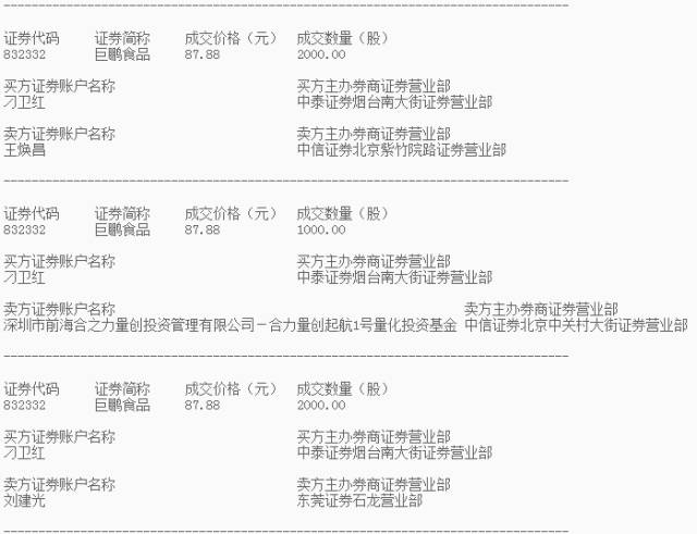 根据股转系统披露的交易公开信息,巨鹏食品这笔异常交易的买方账户为“刁卫红”,卖方分别是“王焕昌”、“刘建光”、深圳市前海合之力量创投资管理有限公司-合力量创起航1号量化投资基金。