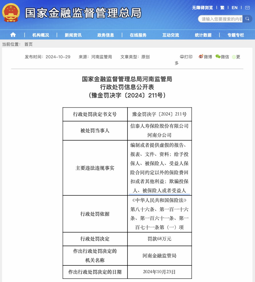 10月30日,国家金融监督管理总局河南监管局行政处罚信息公开表显示,信泰人寿保险股份有限公司河南分公司被罚款68万元。主要违法违规事实为:编制或者提供虚假的报告、报表、文件、资料;给予投保人、被保险人、受益人保险合同约定以外的保险费回扣或者其他利益;欺骗投保人、被保险人或者受益人。