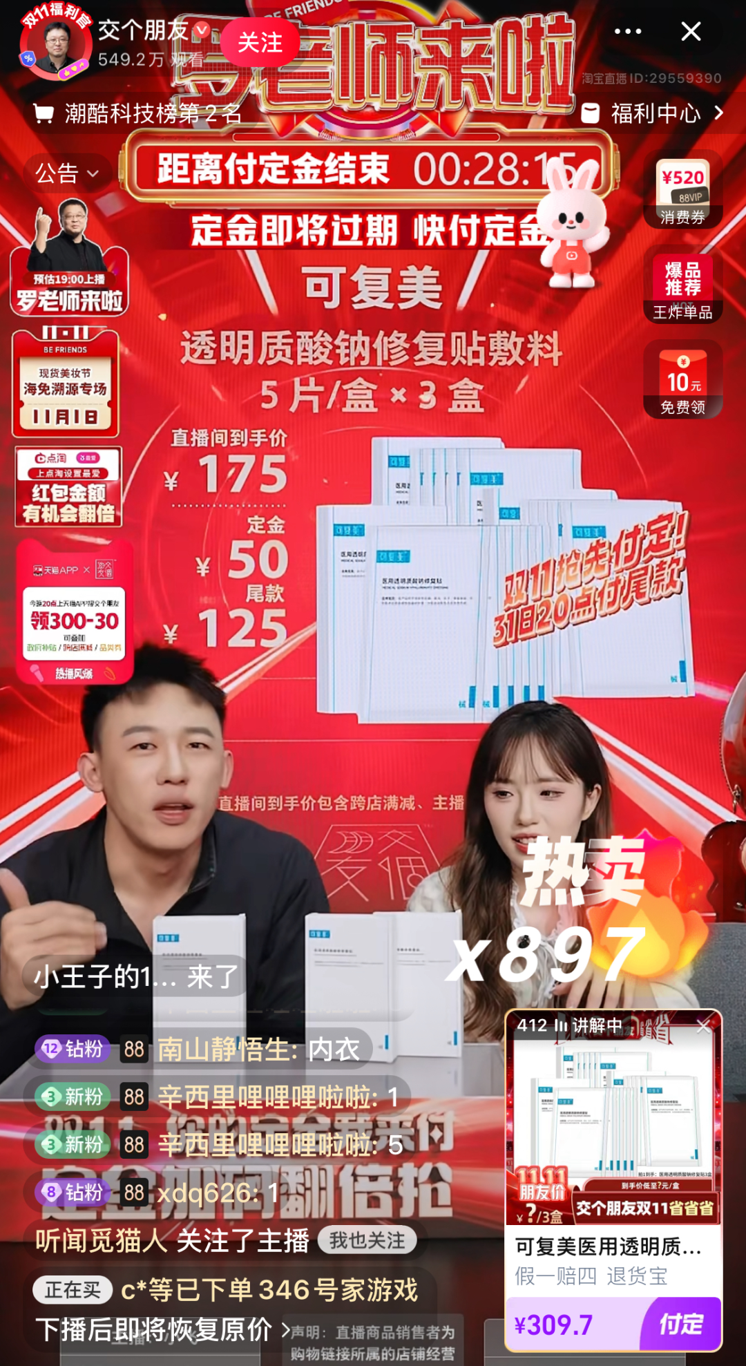 但双11情况发生逆转。李佳琦、辛巴和交个朋友三大老牌头部主播都重新热起来了。尤其李佳琦从一开始就火力全开。