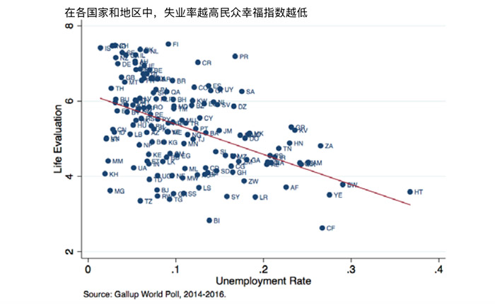 一个人因失业造成的负面情绪会传染给身边的家人,而且部分人的失业是对劳动供需市场形势不景气的信号,尤其会对失业者同行业在职人带来不安。总体看来,失业率、社会福利制度与民众幸福感之间成负相关。