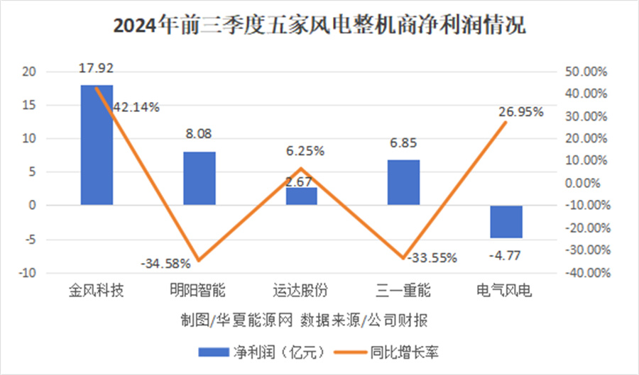 从前三季度整体业绩来看(下图),五家风电整机商中,两家公司——明阳智能与三一重能净利润同比上一年出现了负增长。