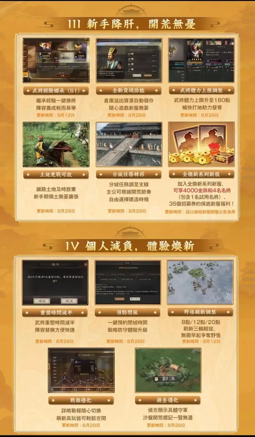 《三国志:战略版》在《三国:谋定天下》开服首月便开启了同步“降肝”优化,增加同盟器械“工程车”,实现自动铺路,并在7月份的新赛季中推出了包括货栈防爆仓、武将体力上限调整、土地免战设置及一键预约闭城等多项减负措施,旨在进一步提升玩家体验。