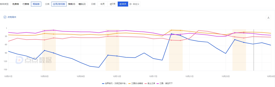 《三国:谋定天下》的创新搅动了SLG市场,倒逼多家头部选手进行同步优化和价格战。然而,随着首批服务器即将走完三个赛季,市场震荡期结束,市场开始重新归于平稳。根据点点数据,10月期间,《三国:谋定天下》、《率土之滨》、《三国志:战略版》在IOS畅销榜排名均在30位左右徘徊。而《世界启元》则稳定在畅销榜前100位,并在月末逐渐回升至这一区间的上游,成为SLG赛道上“率土like”游戏的新四强之一。