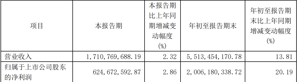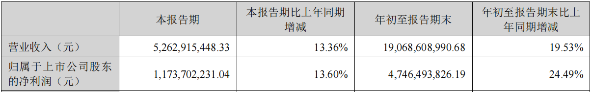 财报数据显示,古井贡酒2024年第三季度实现营业收入52.63亿元,同比增长13.36%;归母净利润11.74亿元,同比增长13.60%。