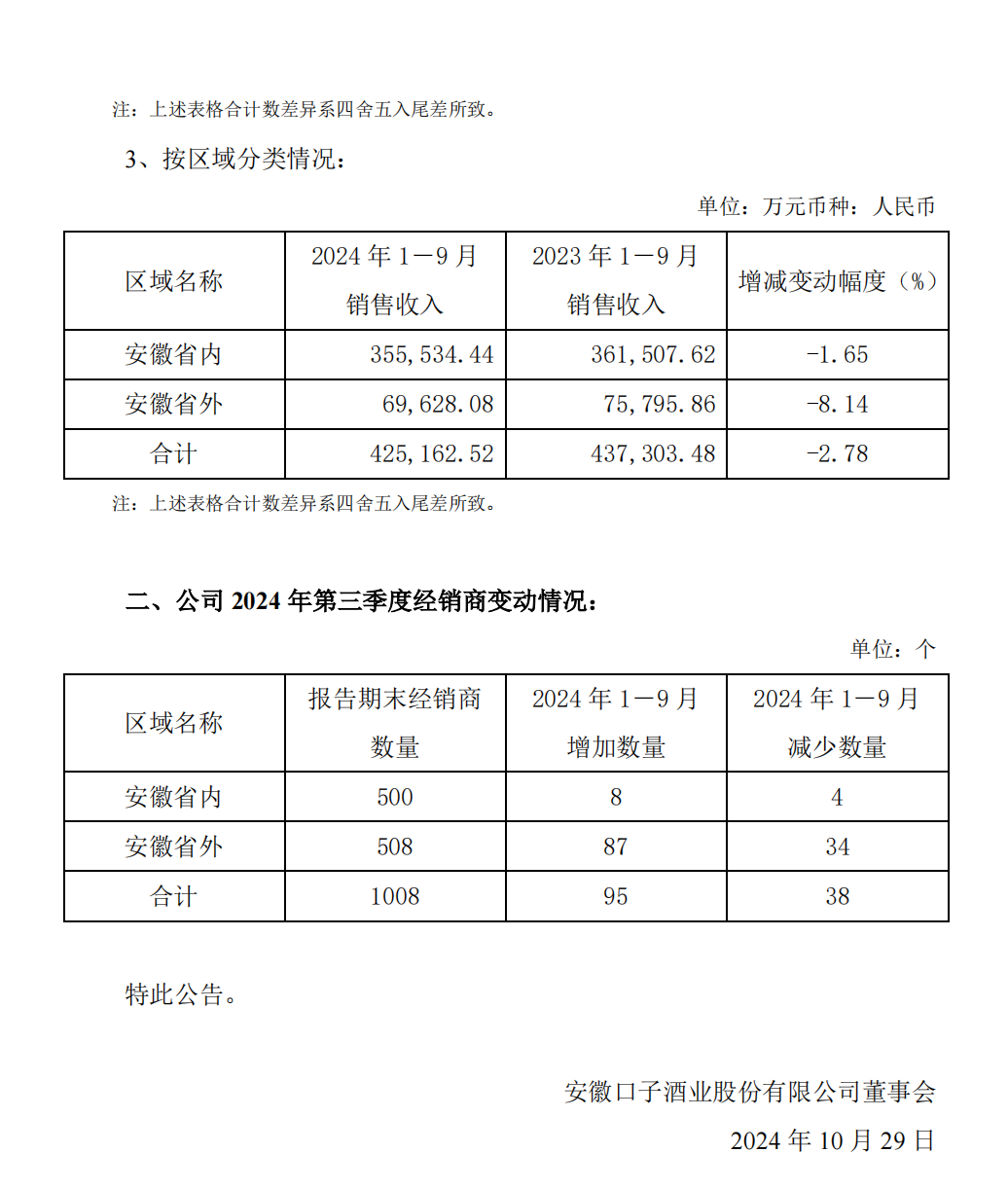 2024年前三季度,口子窖,安徽省内销售收入为35.55亿元,而省外销售只有6.96亿元,同比下降8.14%;金种子酒,安徽省内收入为5.12亿元,而省外收入只有1.41亿元。
