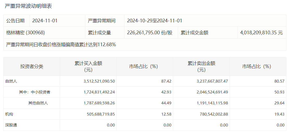 11月1日,深交所披露,格林精密10月29日至11月1日累计上涨107.31%,涨幅严重异常期间获自然人买入35.13亿元,占比87.42%。其中,中小投资者累计买入17.25亿元,占比42.93%。机构投资者累计买入5.06亿元,占比12.58%。