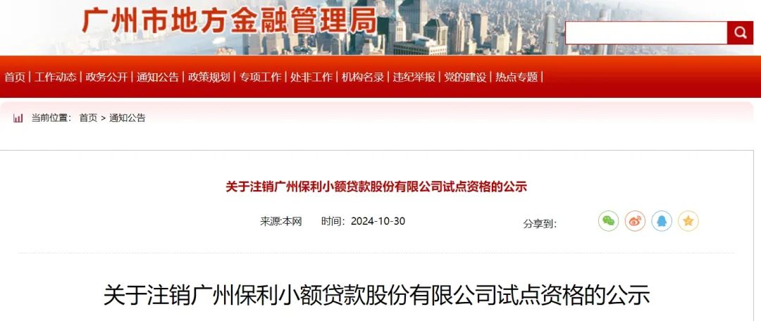 10月30日,广州市金融监管局发布了一则公告,内容是关于注销广州保利小额贷款股份有限公司(以下简称“保利小贷”)试点资格的公示。