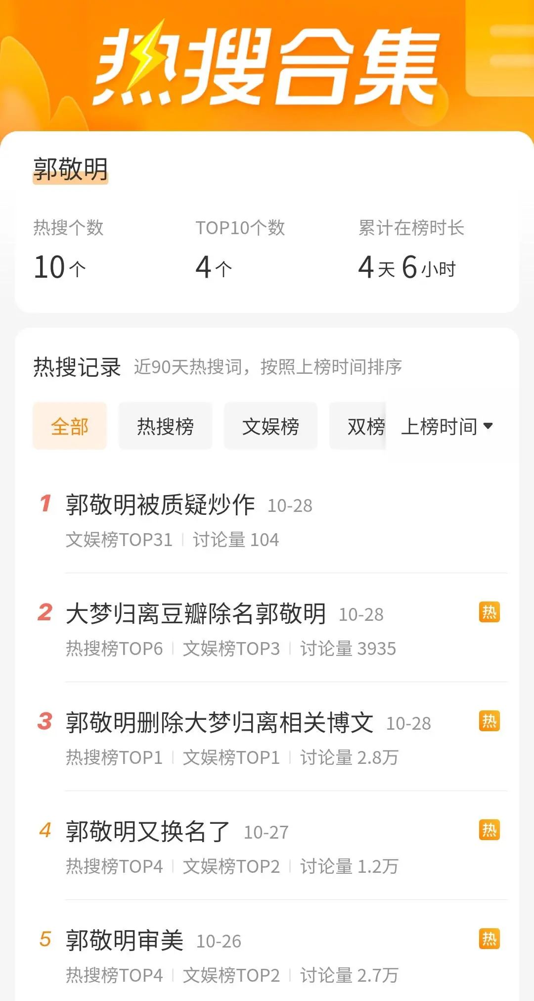 《大梦归离》在10月26日晚空降,事出紧急,前期营销不足,连播两天热度平平,郭敬明赶忙“献祭”自己,用一个#郭敬明删除大梦归离相关博文# 的词条为这部剧推出了“热一”热搜。
