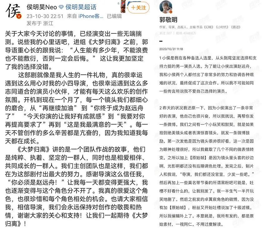 当日郭敬明先是发布了情绪化的微博,随后发布2000字长文回应侯明昊粉丝,侯明昊500字微博同时解释这件事。对网友来说,这无疑是艺人在导演与粉丝之战中被“架在火上烤”,不过相信熟悉于正的网友,对这样的做法就并不陌生了。