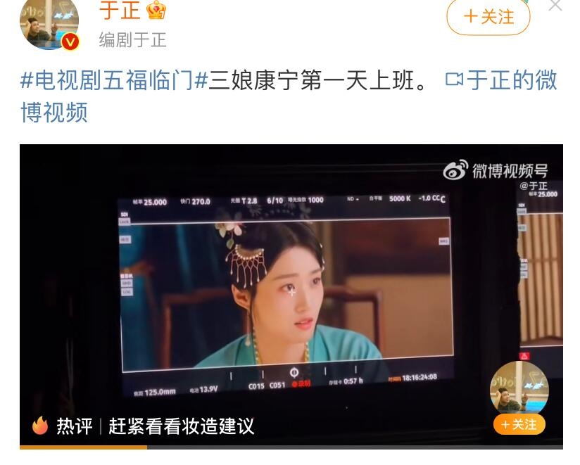比如在于正年初拍摄《五福临门》时开始效仿郭敬明的分享“原始帧”发微博,不过和“郭敬明审美”下的精修质感不同,于正是用导演监视器的屏摄作为原始帧发布,结果被网友拿出卢昱晓分别在《云之羽》和《五福临门》中的“原始帧”对比,一致认为她在郭敬明剧的妆造效果更美,至今无法被打破。