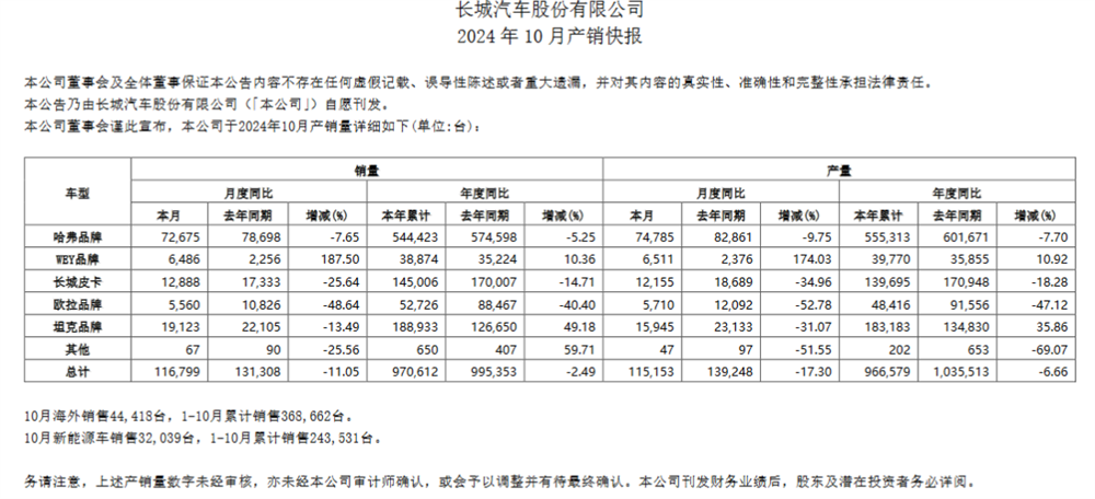 其中,哈弗品牌销量为7.27万辆,同比下降7.65%;WEY品牌销量为6486辆,同比增长187.5%;长城皮卡销量为1.29万辆,同比下降25.64%。欧拉品牌销量为5560辆,同比下降48.64%;坦克品牌销量为1.91万辆,同比下降13.49%。10月海外销售4.44万辆,新能源车销售3.2万辆。