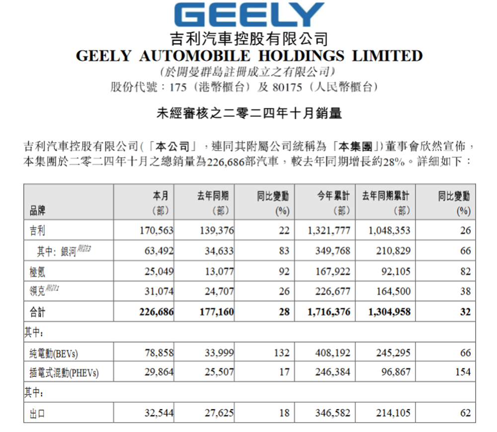 吉利汽车在10月份和2024年的累计销量也实现了显著增长,其中吉利品牌销量为17.06万辆,同比增长22%。