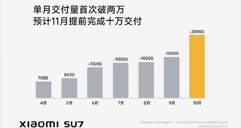 小米汽车周二曾透露10月销量突破2万辆,今天也进一步确认2024年10月份小米SU7交付量超过2万台。